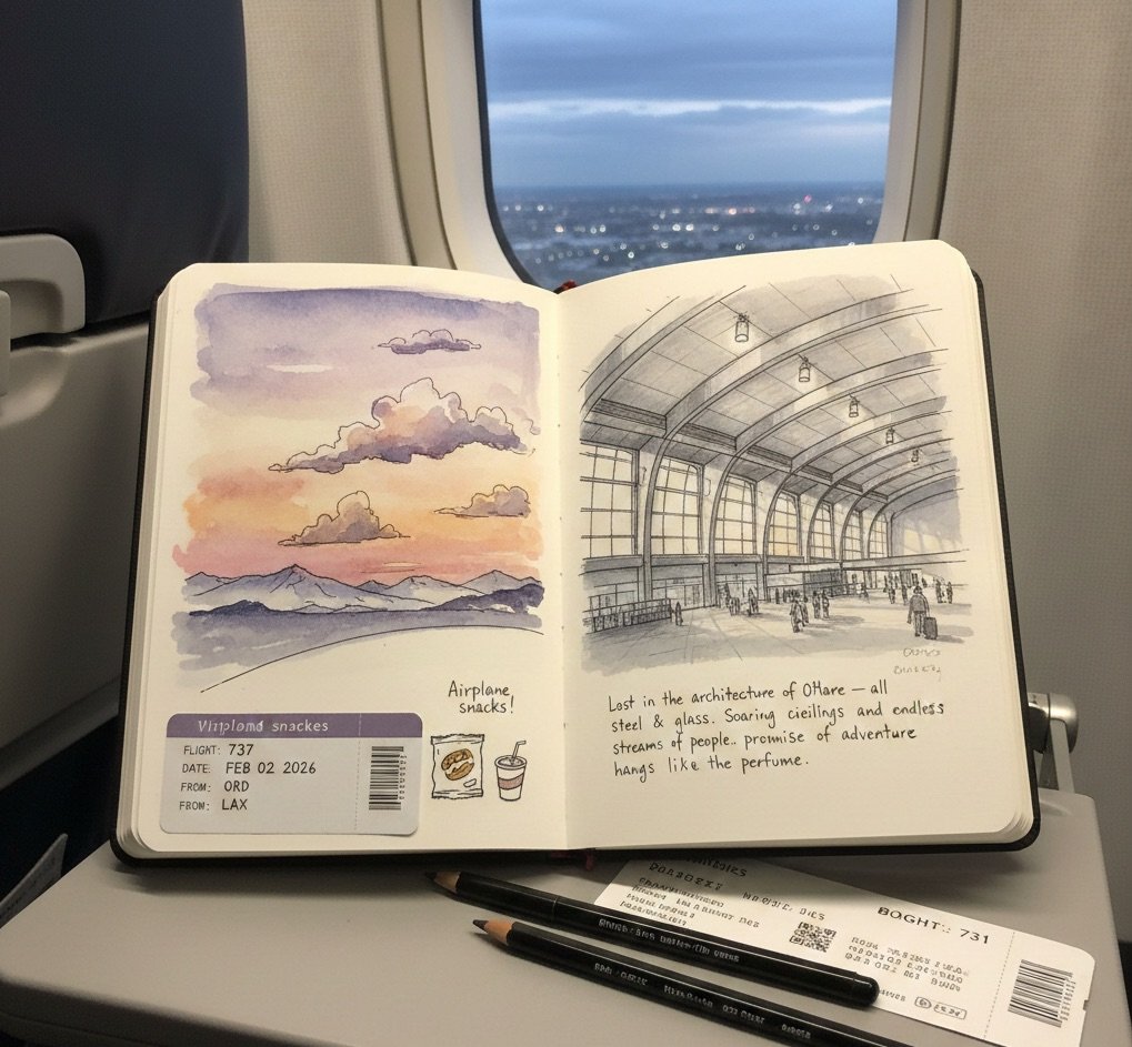 Use your sketchbook to document the journey—boarding scenes, airport architecture, snacks, ticket stubs, or notes about your destination. These small details enrich your travel diary and make your sketchbook feel alive.
