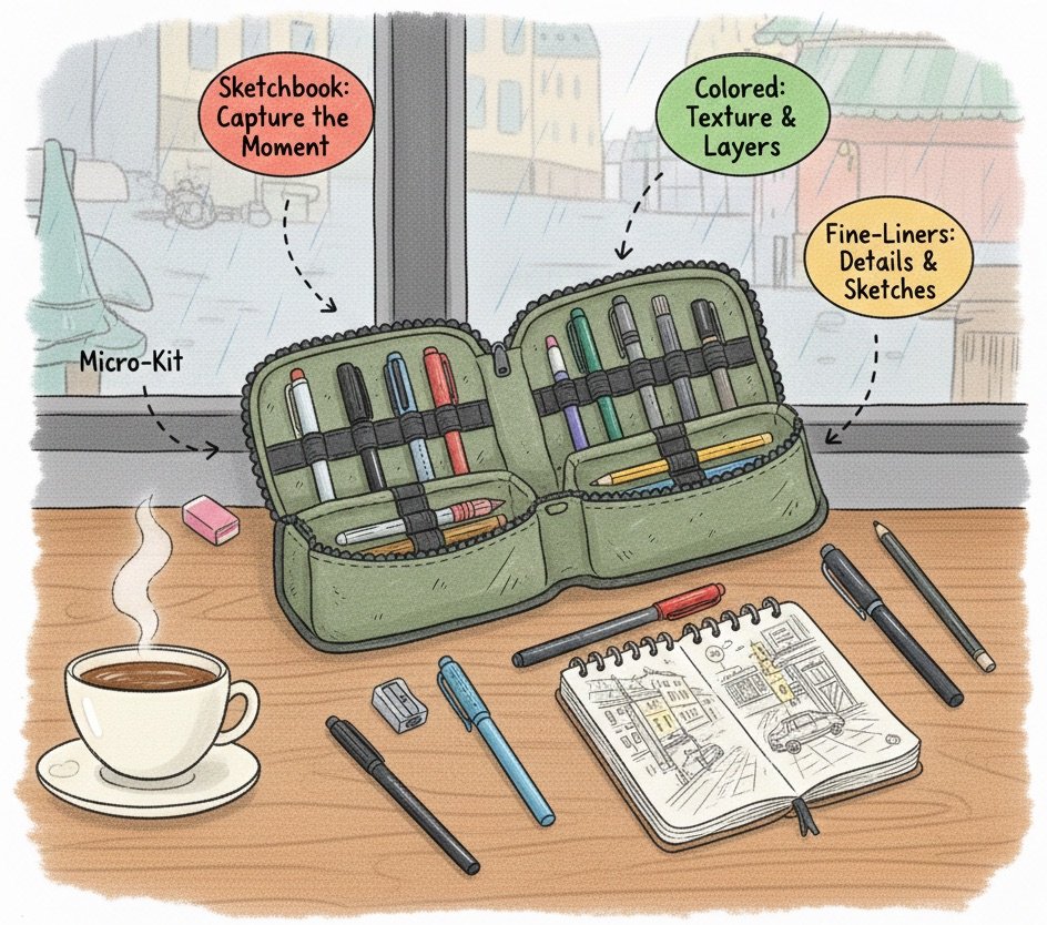 A compact kit keeps you nimble. Water brushes, a few fineliners, and a lightweight sketchbook allow you to work quickly without feeling weighed down. The goal is spontaneity — tools that let you draw the moment before it slips away.